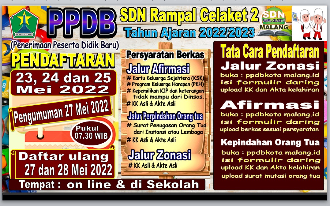 PENERIMAAN PESERTA DIDIK BARU SDN RAMPAL CELAKET 2 TAHUN AJARAN 2022/2023
